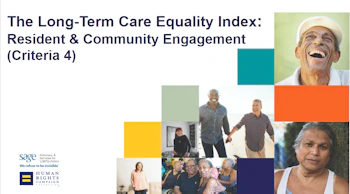 This webinar covers LEI Survey Criteria 4: Resident and Community Engagement. This criterion helps long-term care communities ensure that 1) LGBTQ+ residents are connected to the greater LGBTQ+ community and 2) that the housing community builds relationships with the greater LGBTQ+ community.